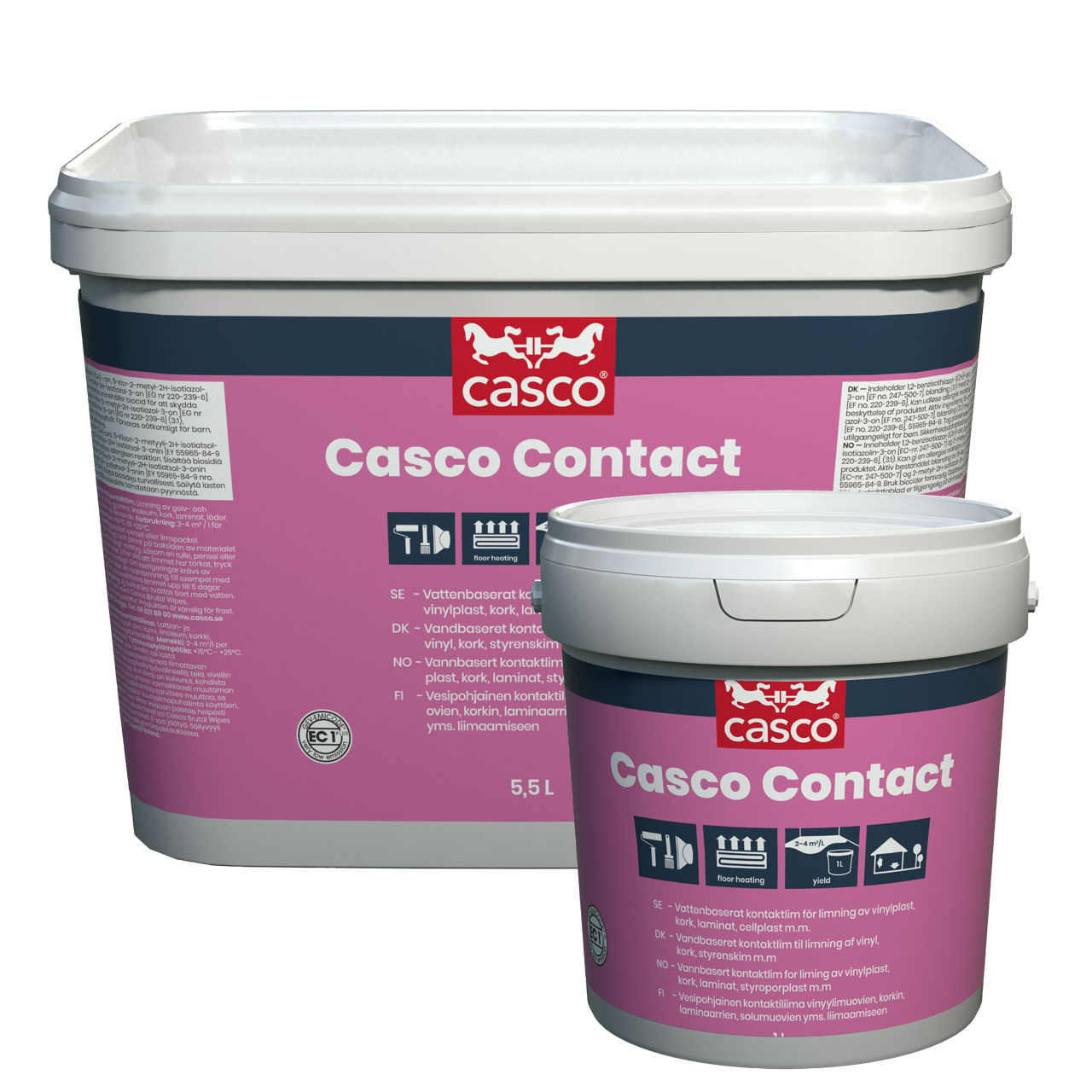 Casco Contact används för limning av golv och väggar med vinylmattor, PVC-mattor, gummimattor (ej EPDM), linoleum, kork, laminat, läder, textil och metall.