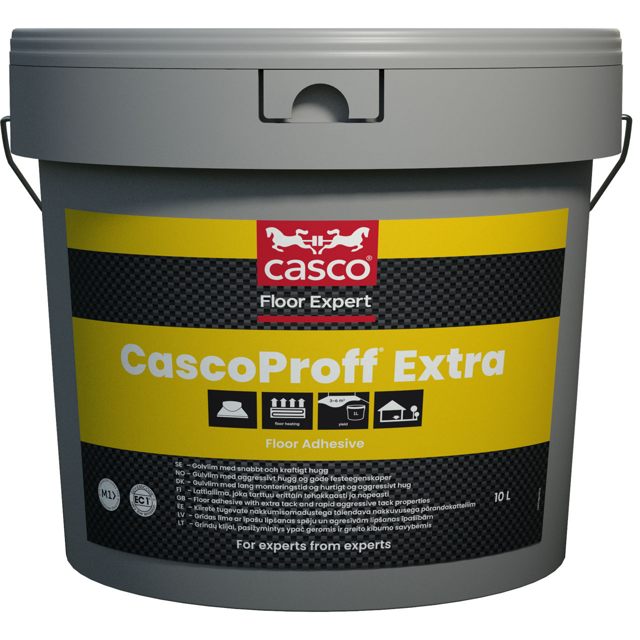 Casco® Proff Extra är ett golvlim utvecklat för limning av PVC, LVT, textila golv samt vissa plastmattor utan PVC. Produkten fungerar även för gummigolv upp till 4 mm.