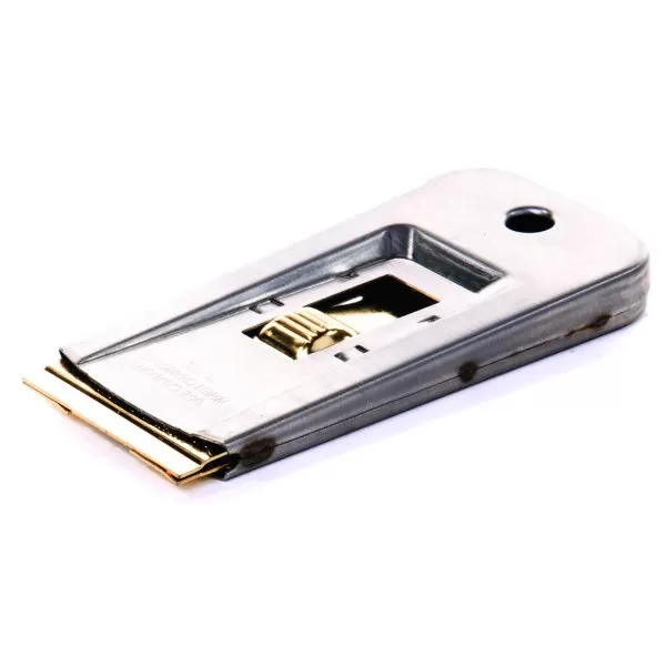 Clickskrapa i stål med mässingskropp. Ställbart blad i 3 lägen – idealisk för borttagning av färg, kitt, spackel och fog.