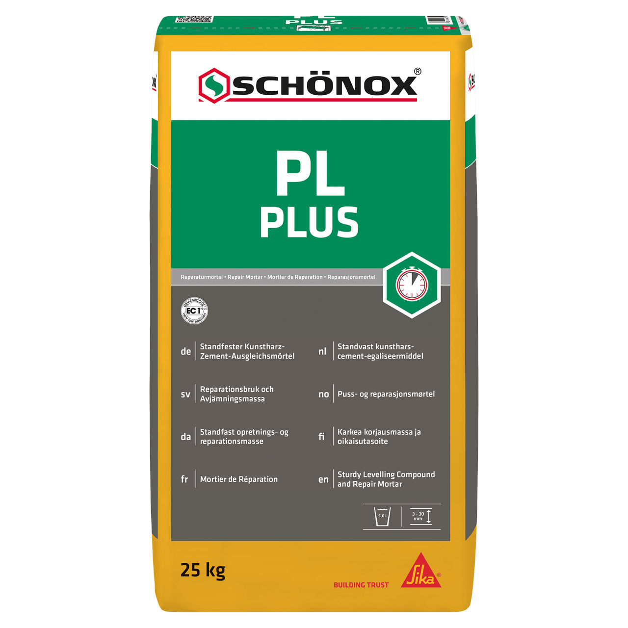 Schönox® PL Plus är ett snabbhärdande, cementbaserat mur- och lagningsbruk för både inom- och utomhusbruk. Produkten används för lagningar, hål, trappor och fallspacklingar, samt som underlag för keramiska plattor, parkett och andra beläggningar.
