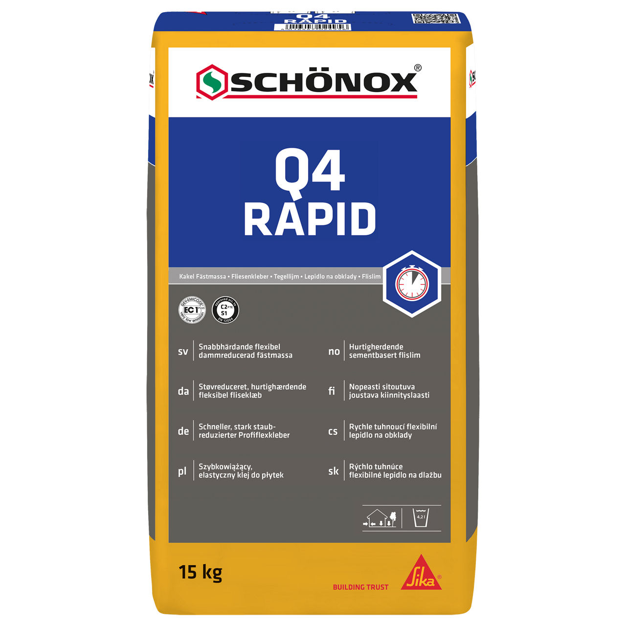 SCHÖNOX Q4 RAPID är en snabbhärdande, dammreducerad fästmassa för montering av kakel, klinker, granitkeramik och natursten.